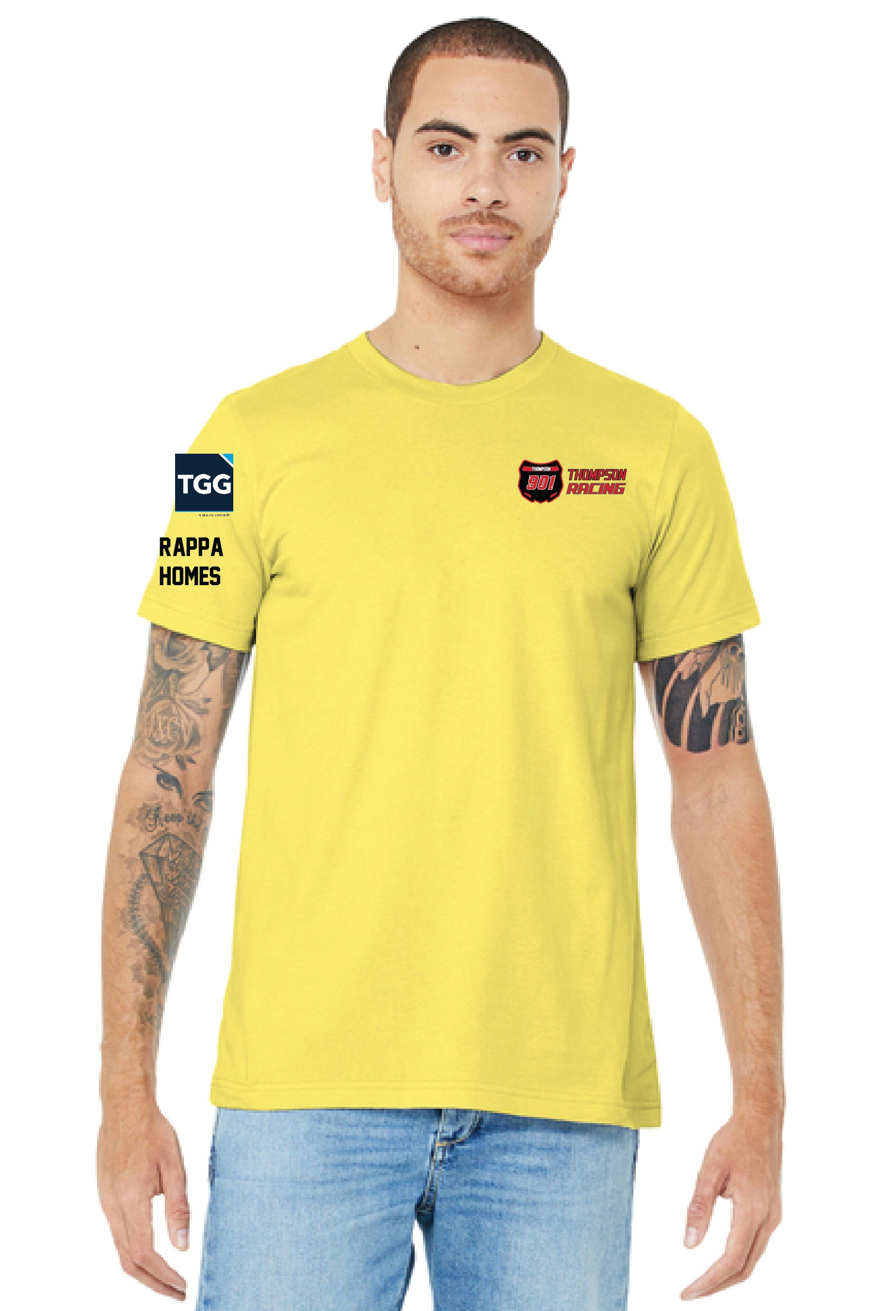 This Thompson Racing Yellow Bella-Canvas T-Shirt will have sponsors printed on it as seen in the pictures as well as on the team name and # on the front and back.