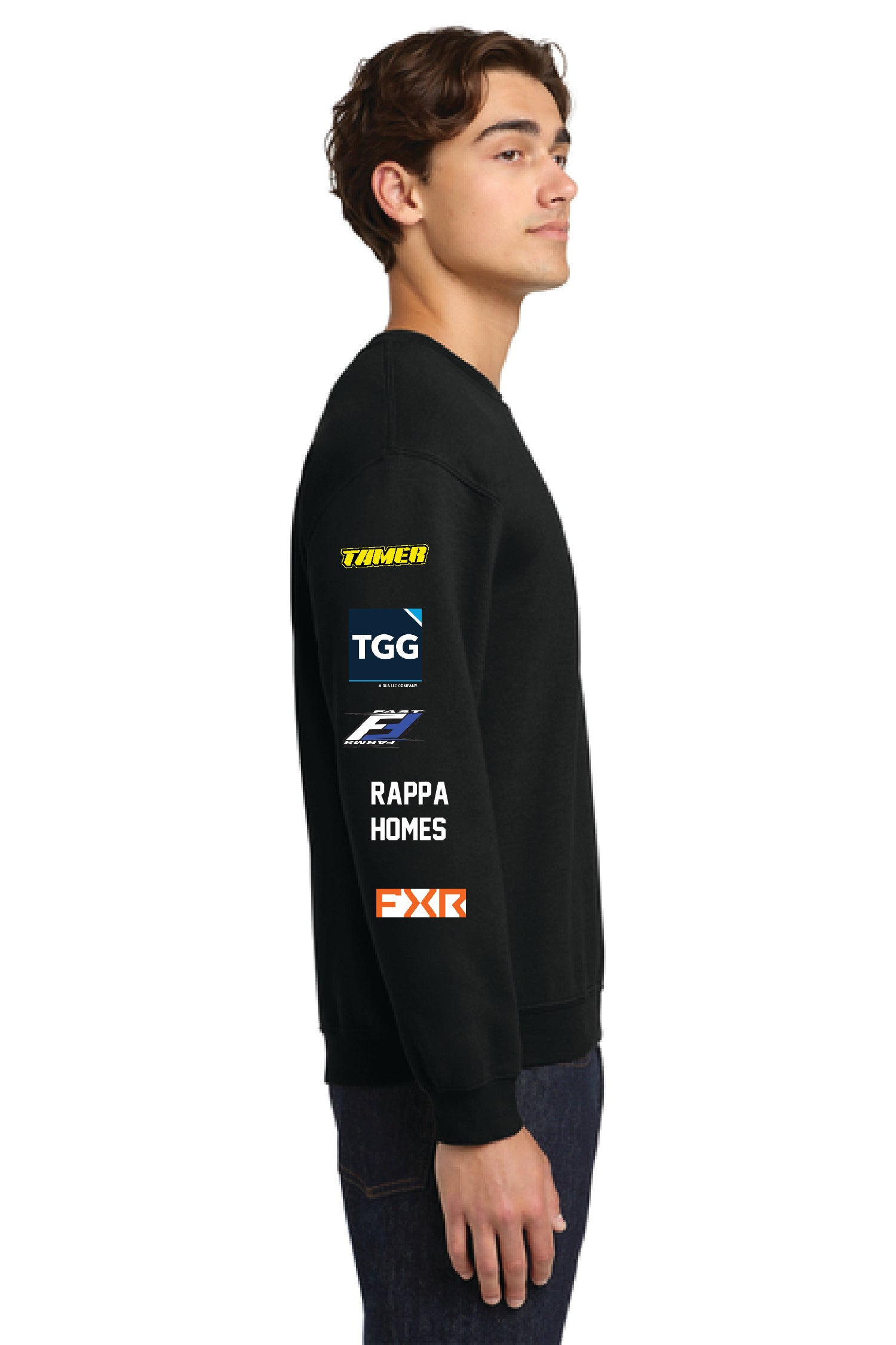This Thompson Racing Black Gildan Crewneck Sweatshirt will have sponsors printed on it as seen in the pictures as well as on the team name and # on the front and back.